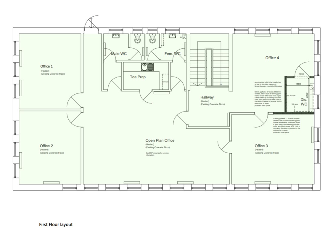 The available office suite occupies the upper floor of a two-storey detached property. The premises have been extensively refurbished to a high standard providing new suspended acoustic ceiling, electrical wiring, new electric wall-mounted heaters, new kitchen, WCs and low energy LED lighting. The premises have been freshly decorated and carpeted.