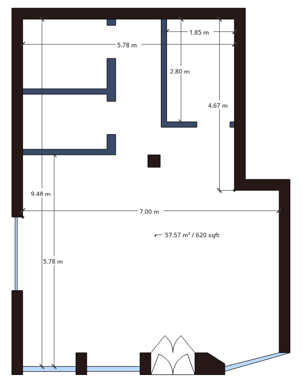 We have calculated the gross internal area to be 57.6 m2 (620 ft2)