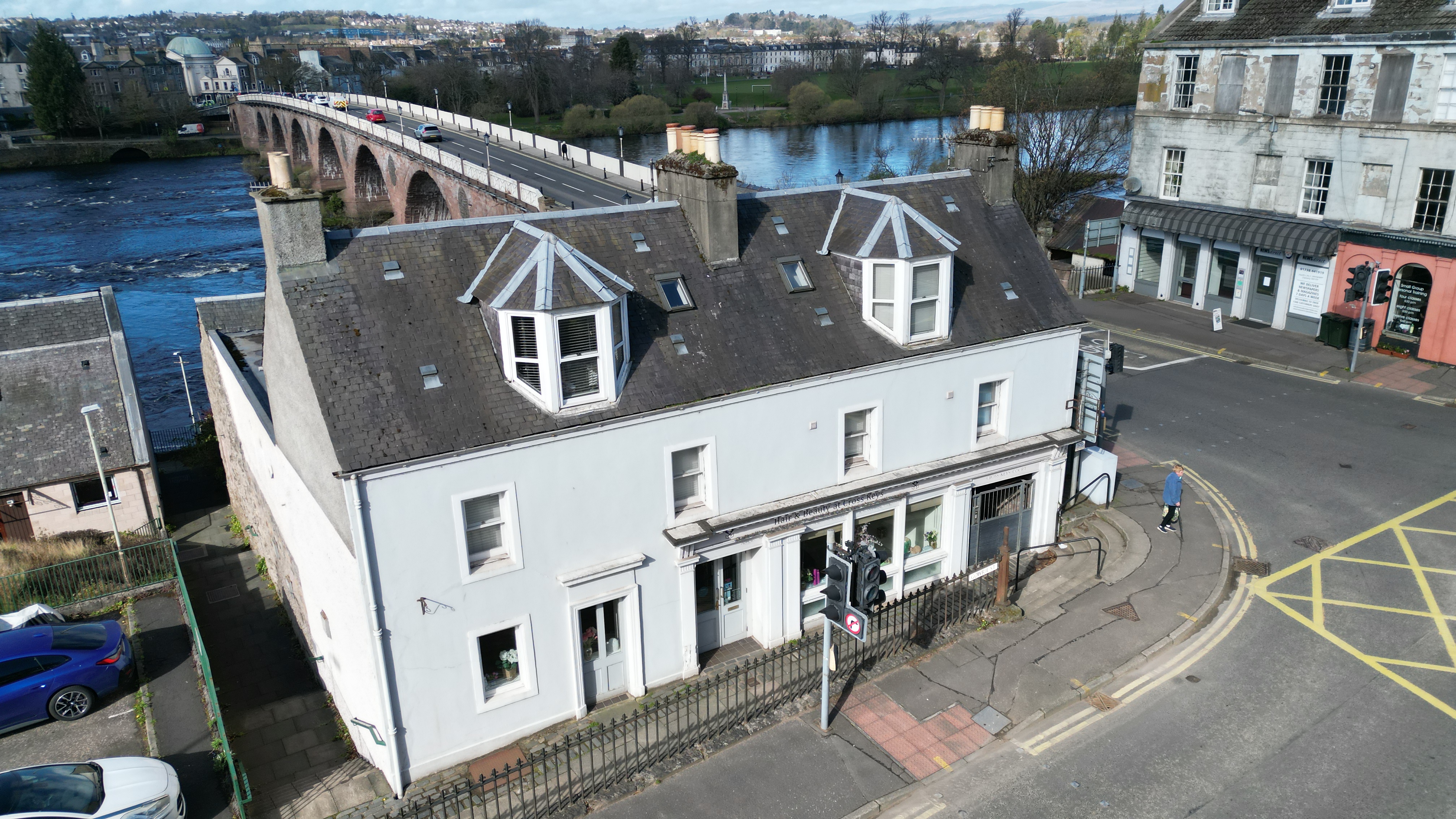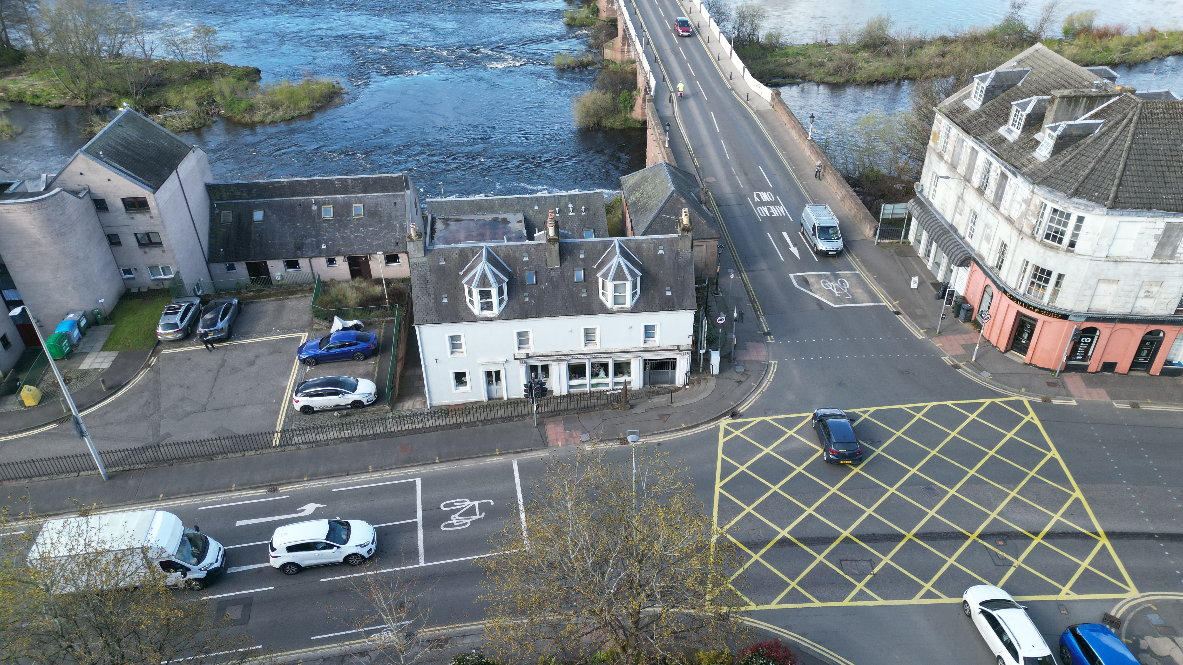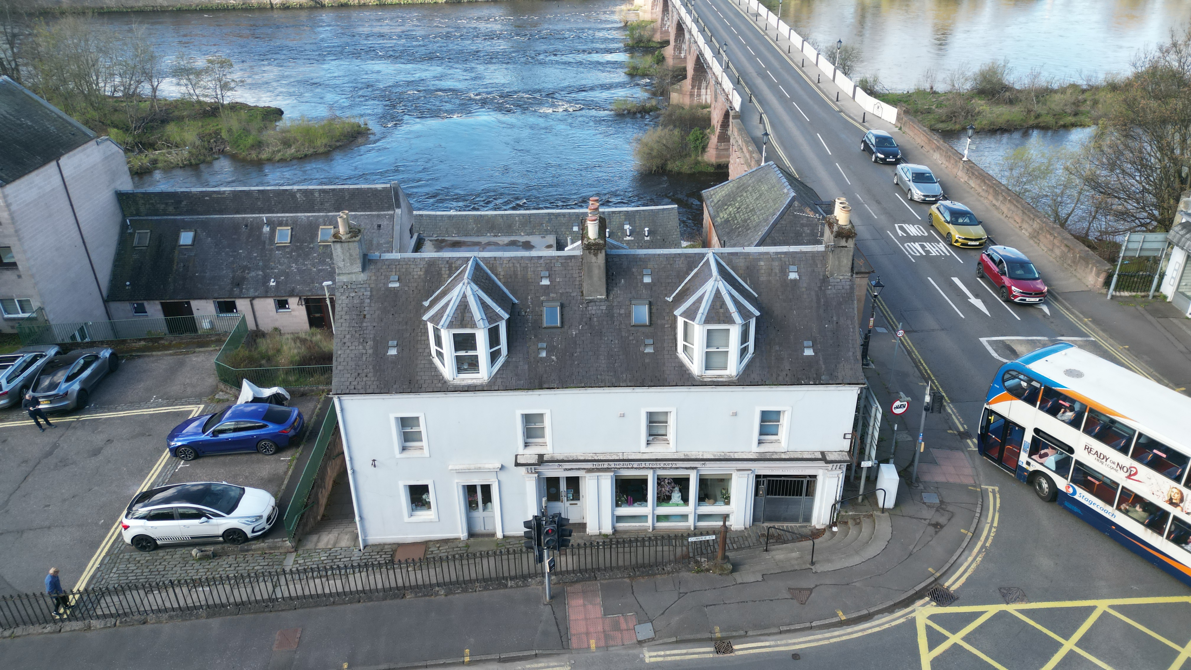 The subjects occupy a highly prominent corner position at the busy junction of Bridgend and the Old Perth Bridge, one of the principal gateway routes into Perth city centre. The location benefits from strong passing traffic, excellent visibility and immediate proximity to the River Tay, with a public pay and display car park located directly opposite.